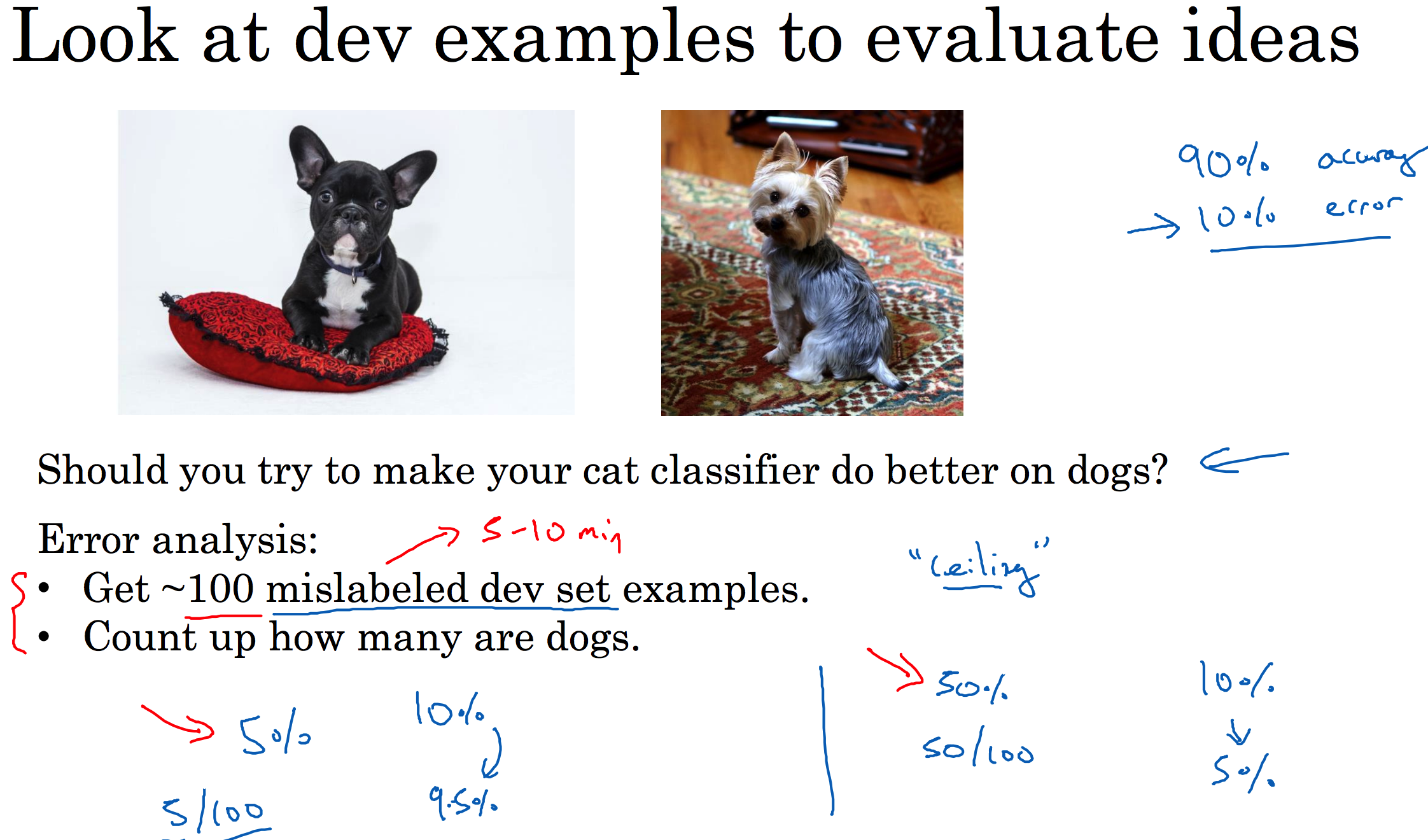 case1:若100个误分样本中仅有5个是狗类,那么即使算法改进的再好,将狗类全部识别出来那么精度最多提高高90.5%,即性能上限(ceiling on performance)。