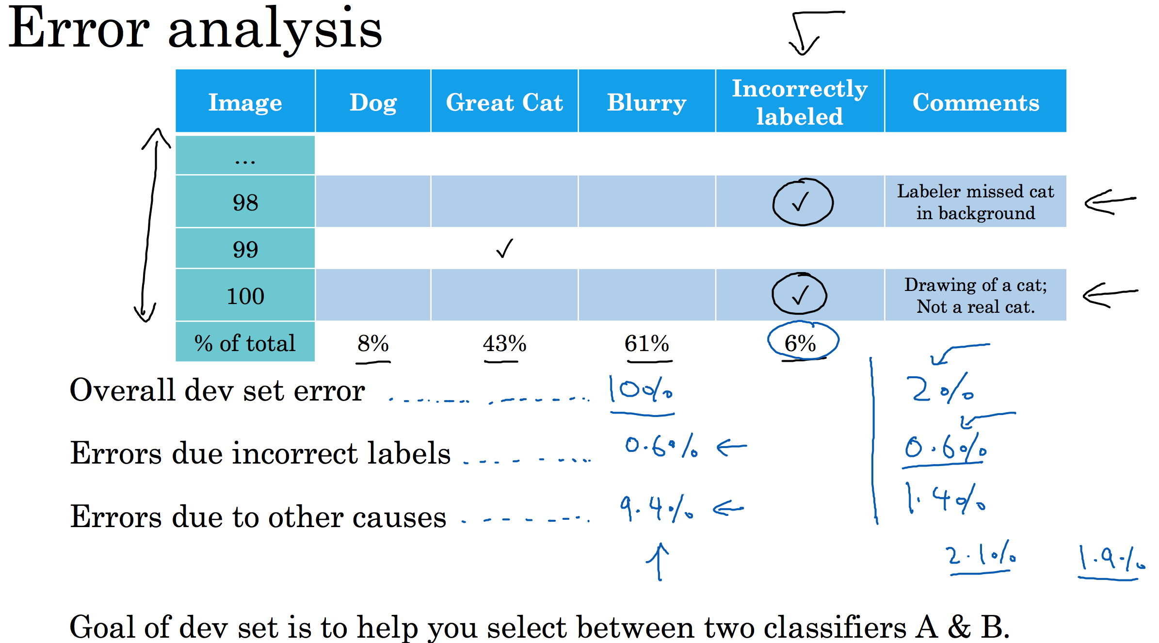 case1: 算法在开发集上的误差为10%,错标样本占据了0.6%,其他原因占据了9.4%。显然这9.4%所带来的影响才是优先考虑的目标,改正错标样本带来的误差虽然也是需要的但是并非首要考虑的方面。