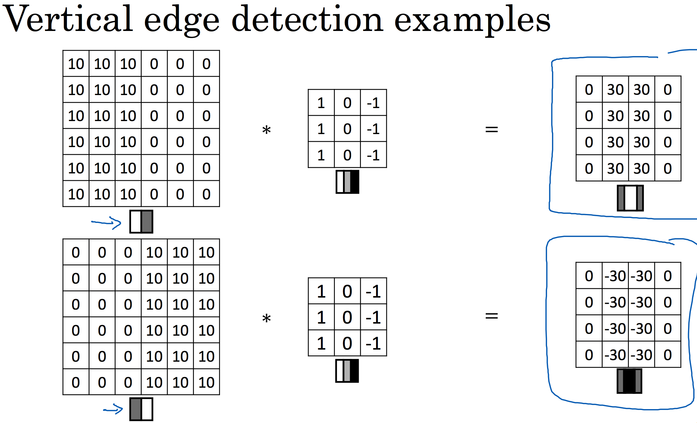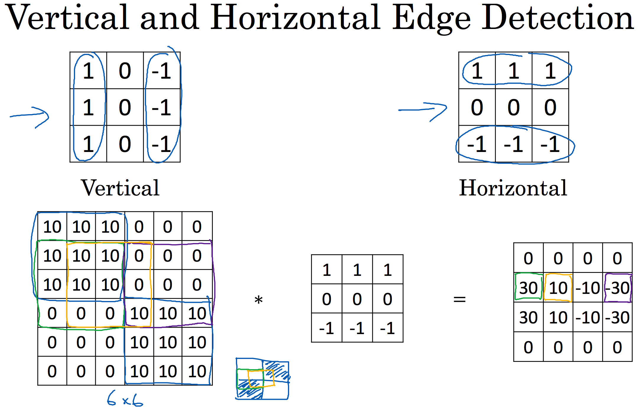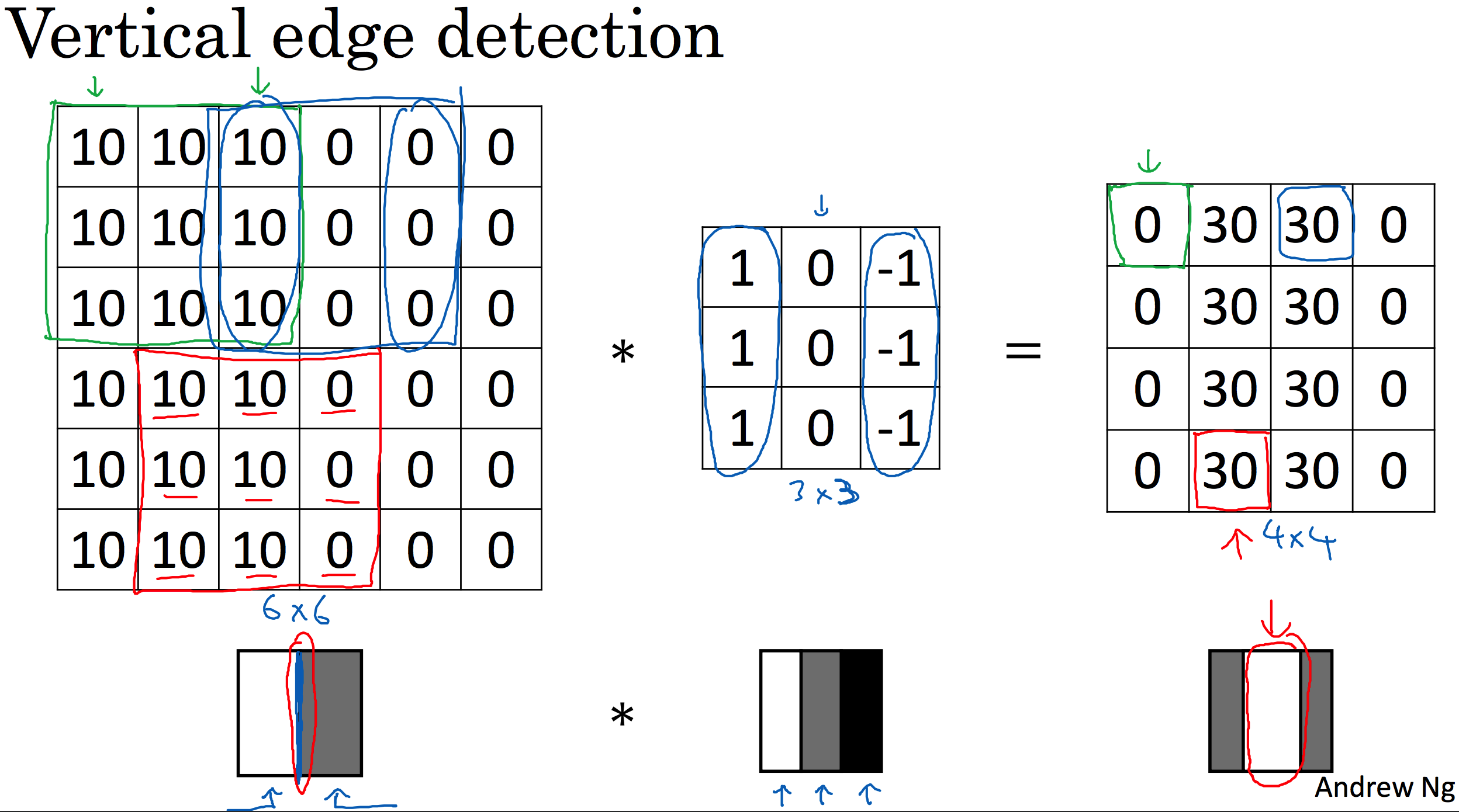 原始图像大小为6x6x1,垂直边缘检测算子,又称为核或滤波器(kernel/filter),大小为3x3x1,经过卷积(*)(相乘再相加)后得到4x4x1的影像,即为边缘检测后的影像。卷积后影像尺寸为:6-3+1 = 4。
