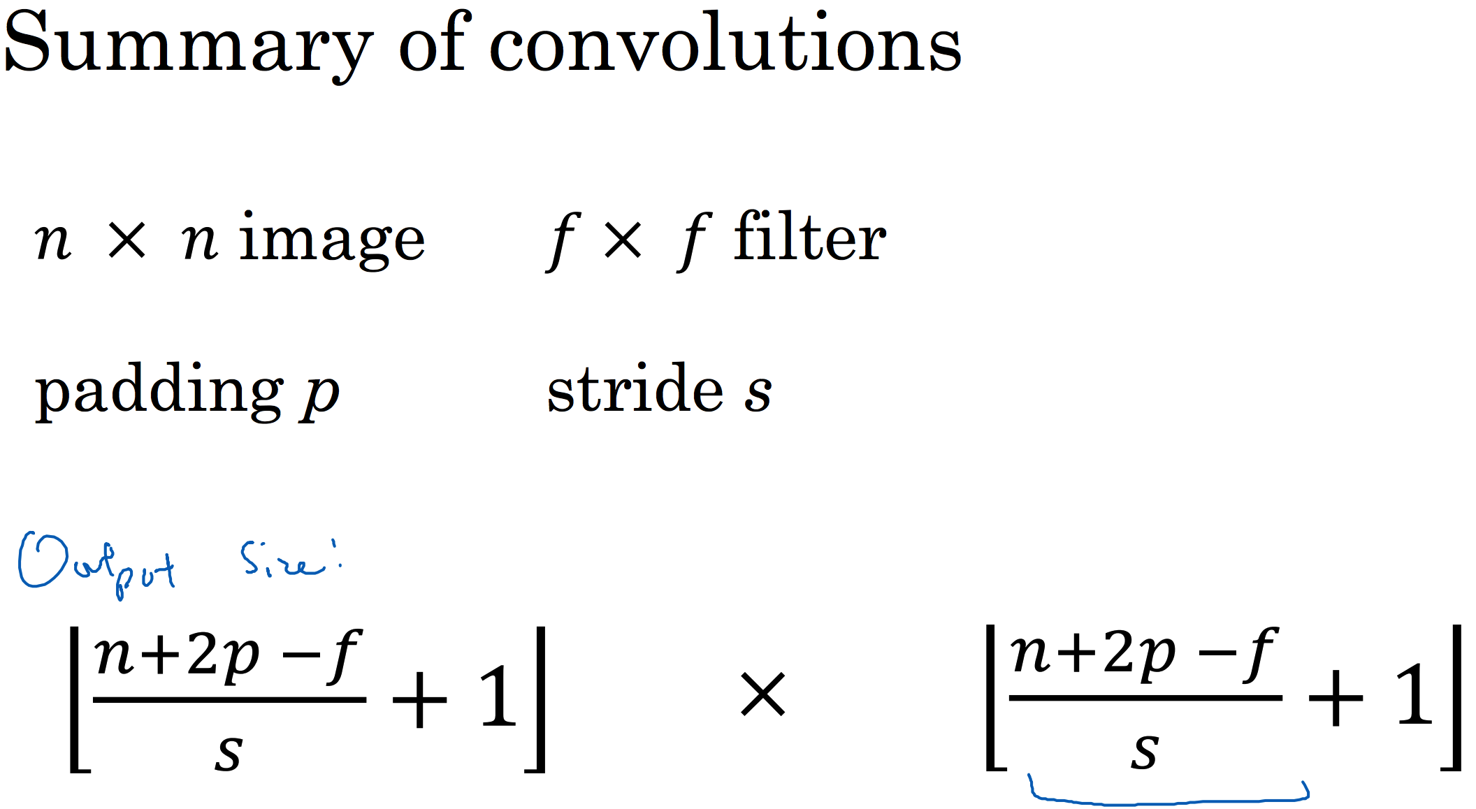 原始影像尺寸: n x n x c 卷积核尺寸: f x f x c x m 取步长stride为1,padding为0,则经过卷积后的影像尺寸为: (n-f+1) x (n-f+1) x m