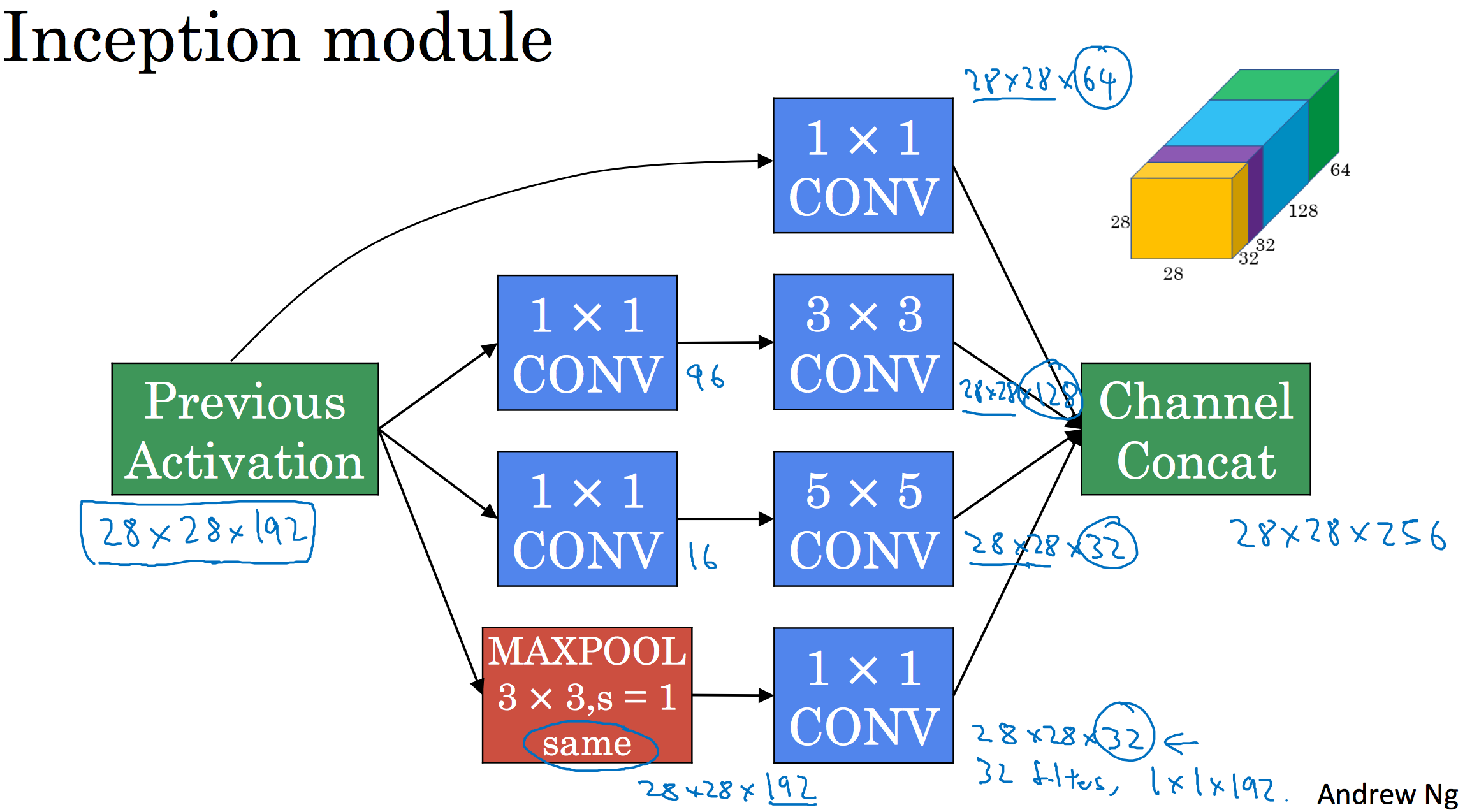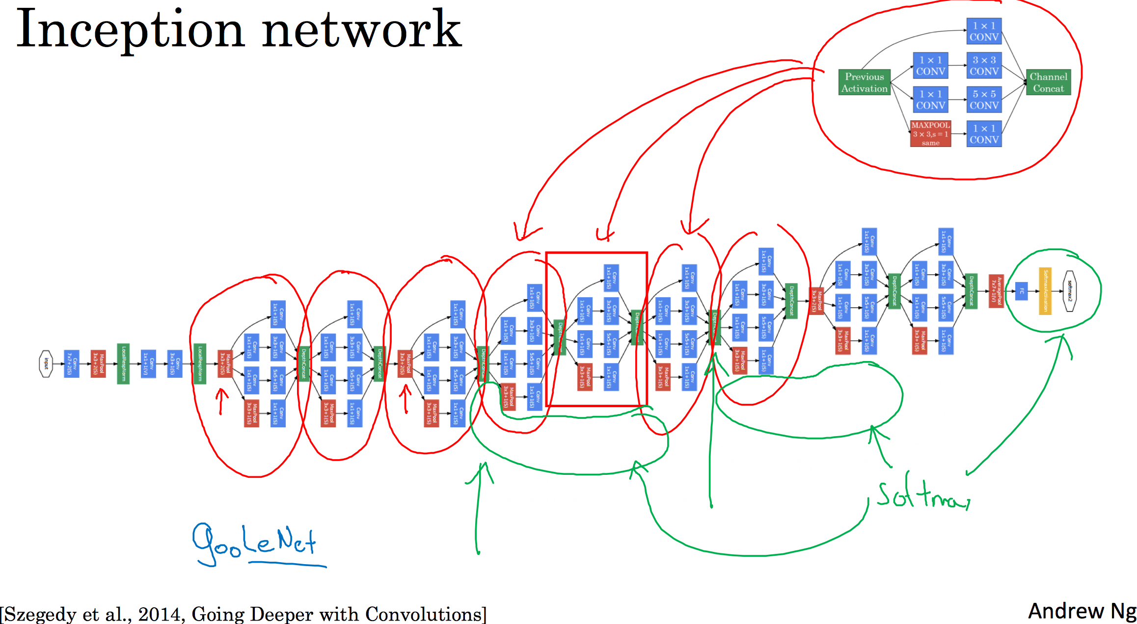 Inception网络,即是很多个Inception模块一环接一环,最后组成了网络。自从Inception模块诞生以来,经过研究者们的不断发展,衍生了许多新的版本,比如Inception V2、V3以及V4,以及引入了跳跃连接的网络,有时也会有特别好的效果。但所有的这些变体都建立在2.6中基本思想上。