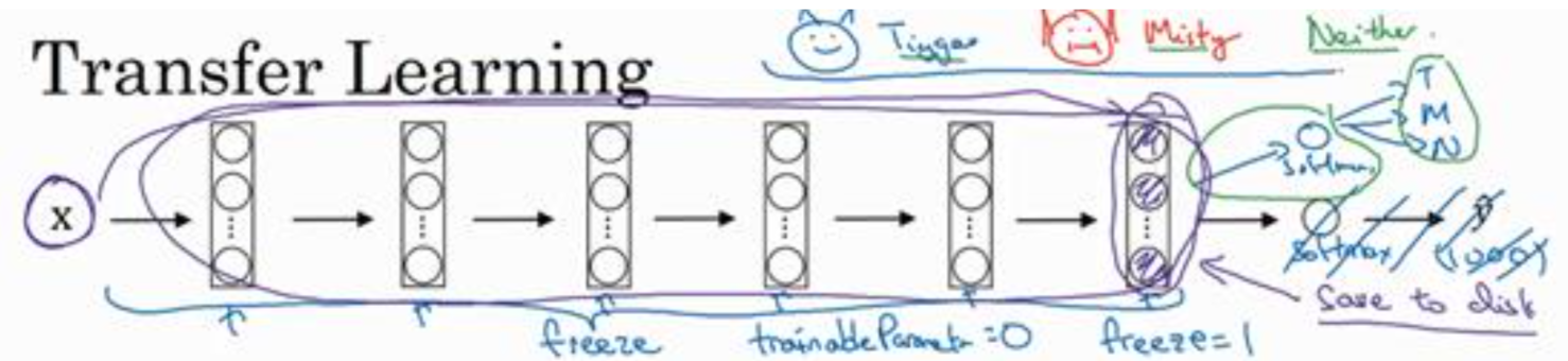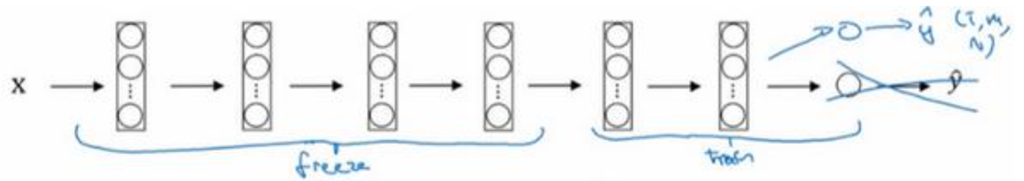 小数据集学习时,可以利用已经训练好的网络,丢掉最后的softmax层,然后创建自己对应类别的softmax层,然后freeze其他层的权重,随后进行训练。当数据集稍大时,可以从后往前依次放开权重,逐次进行训练。如果有一个更大的数据集,也许有足够多的数据,则不要单单训练一个softmax单元,而是考虑训练中等大小的网络,包含最终要用的网络的后面几层。 最后当数据量足够大时,可将训练好的网络权重作为初始化的值,进而训练整个网络,即每次迭代对所有权重进行更新。