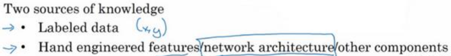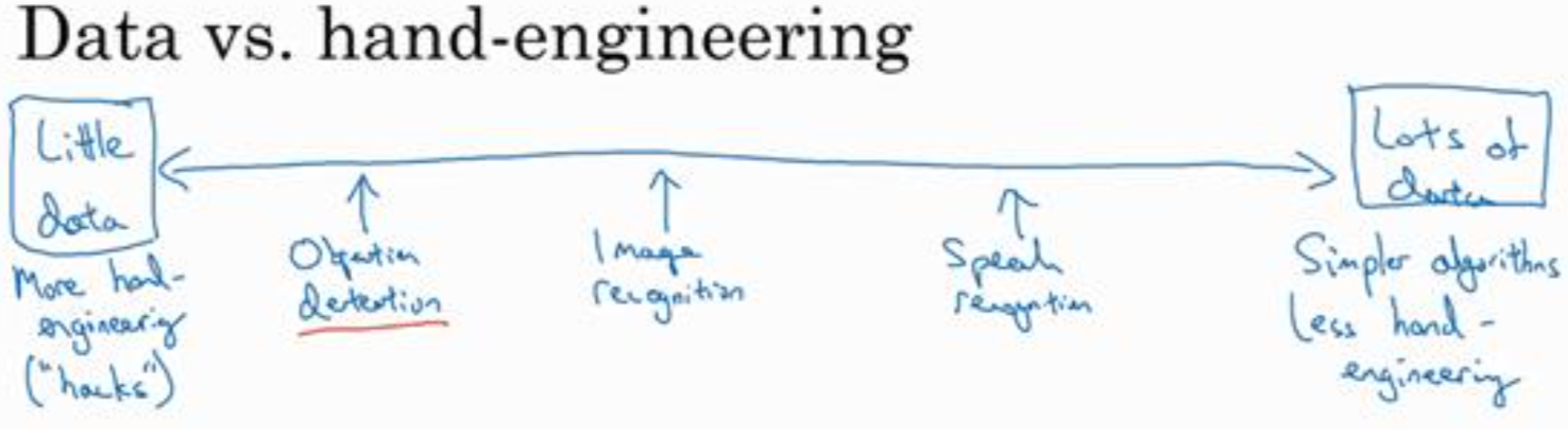 学习算法有两种知识来源:1、来源是被标记的数据,就像(x,y)应用在监督学习;2、来源是手工工程,有很多方法去建立一个手工工程系统,它可以是源于精心设计的特征,手工精心设计的网络体系结构或者是系统的其他组件。所以当没有太多标签数据时,只需要更多地考虑手工工程。