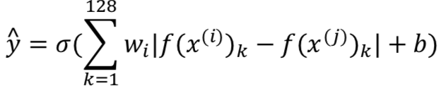 上述公式中,针对两幅影像128维的编码,对每个维度差值的绝对值,增加权重w和偏置b,然后128维累加,最后在进行逻辑归回。除了取差值绝对值之外,还有其他的处理方法,例如Χ平方相似度: