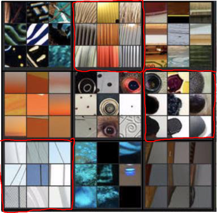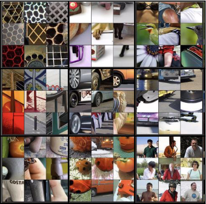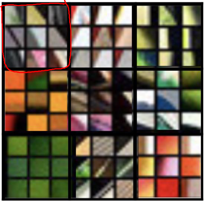 以Alexnet为例,展示卷积神经网络不同隐藏单元之间的计算结果。以layer1为例,由于使用了ReLu激活函数,那么寻找能够使得该层单元激活最大的图片或图片块,即找到哪一张图片最大的激活了特定单元。