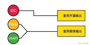 复用模式输出连接的是MCU的内部外设,例如PWM、USART、IIC。具体用复用开漏输出还是复用推挽输出,这个就要根据外设需求来设置,例如IIC在使用时需要用到线与特性,就必须在程序里配置IO引脚为复用开漏输出;像UART或者PWM功能,需要IO口高速变化确定的高低电平,则必须配置为复用推挽输出。