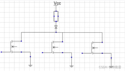 例如在使用MCU自带的IIC模块时,就要求配置想要的管脚为开漏输出模式, 多个开漏输出被接在了同一个线上,下图中如果其中的某个引脚的漏极为低电平,则整个总线上都是低电平,这是“与逻辑”,所以被成为“线与”。因为IIC总线可以接很多个设备,MCU就是通过这种方式判断当前总线的状态。