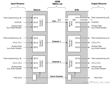 4对TMDS差分信号包括1对时钟信号和3对数据信号,三个数据通道用来发送所有和音视频数据有关的数据,每个通道都有像素数据、控制信号、辅助信号; 时钟通道为接收端提供参考频率,方便解码