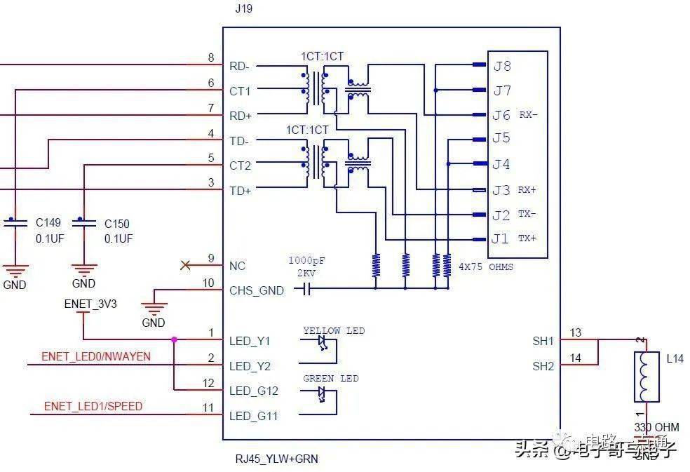 通过PHY芯片后,然后连接一个网路变压器,网络变压器的作用有,增大驱动能力,增强抗干扰能力,还有阻抗匹配和保护隔离的作用。
