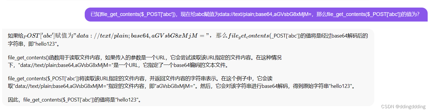 这里可以用到伪协议的data://协议,比如让abc=data://text/plain;base64,aGVsbG8xMjM=