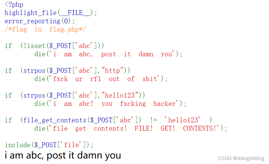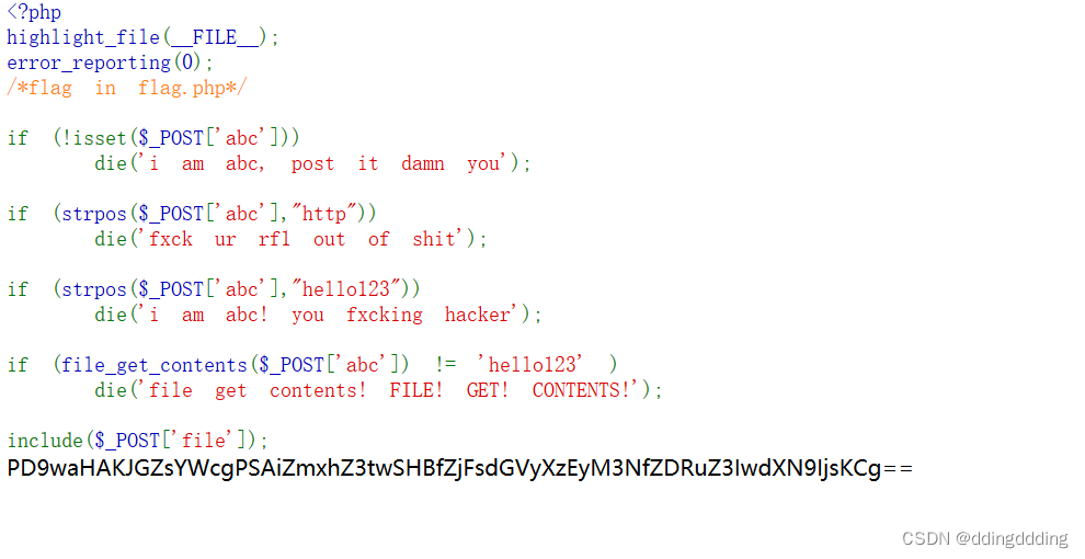 if (file_get_contents($_POST['abc']) != 'hello123' ) die('file get contents! FILE! GET! CONTENTS!');