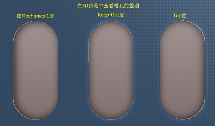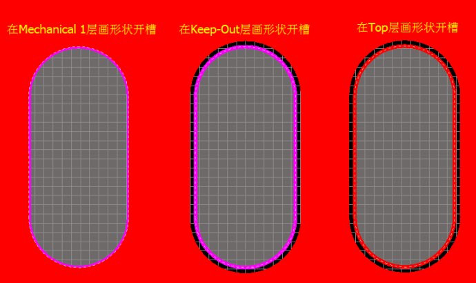 这里说随便哪个层画一个形状都可以,实际情况略有不同。如果画在Keep-Out层的话,会出现覆铜之后槽孔边上没有铜。要想槽孔边上有铜建议使用Mechanical 1层。这点请查看附图体会。