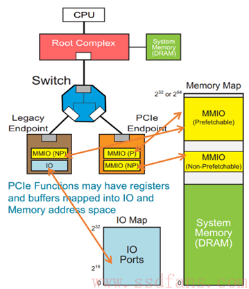 如上图例子,一个Native PCIe Endpoint,只支持Memory Map,它有两个不同属性的内部空间要开放给系统软件,因此,它可以分别映射到系统内存空间的两个地方;还有一个Legacy Endpoint,它既支持Memory Map,还支持IO Map,它也有两个不同属性的内部空间,分别映射到系统内存空间和IO空间。