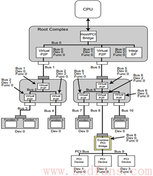在一个PCIe拓扑结构里,一条总线下面可以挂几个设备,而每个设备可以具有几个功能,如下所示: