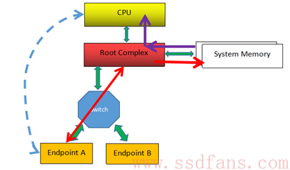 上图例子中,最左边虚线的表示CPU要读Endpoint A的数据,RC则通过TLP(经历Switch)数据交互获得数据,并把它写入到系统内存中,然后CPU从内存中读取数据(紫色箭头所示),从而CPU间接完成对PCIe设备数据的读取。