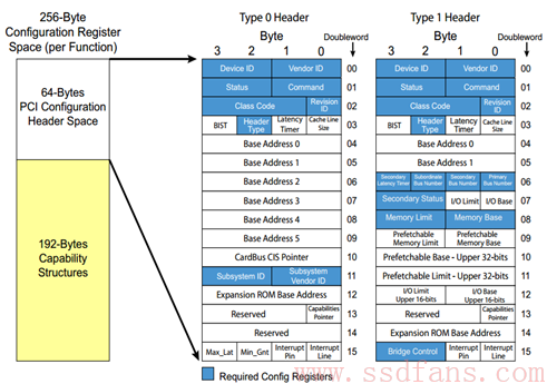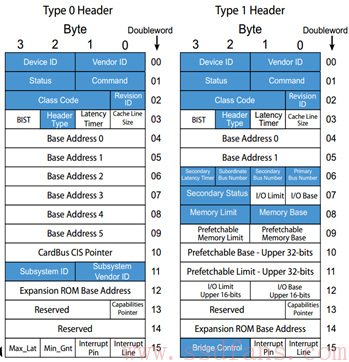 整个配置空间就是一系列寄存器的集合,其中Type 0是Endpoint的配置,Type 1是Bridge(PCIe时代就是Switch)的配置,都由两部分组成:64 Bytes的Header+192Bytes的Capability结构,后者是设备告诉Host它有多牛逼,都会什么绝活。