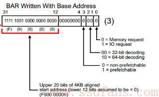 然后系统软件根据这些信息,在系统内存空间找到这样一块地方来映射这4KB的空间,把分配的基地址写入到BAR0: