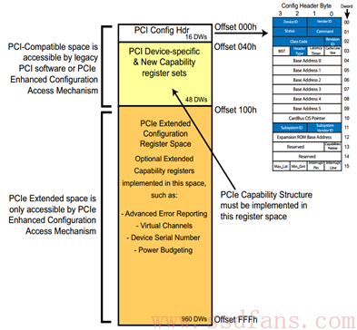 进入PCIe时代,PCIe能耐更大,192 Bytes不足以罗列它的绝活。为了保持后向兼容,又要不把绝活落下,怎么办?很简单,我扩展后者的空间,整个配置空间由256 Bytes扩展成4KB,前面256 Bytes保持不变: