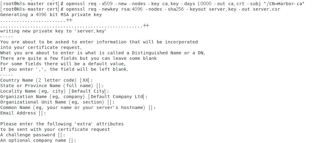 openssl req -x509 -new -nodes -key ca.key -days 10000 -out ca.crt -subj "/CN=Harbor-ca" req 产生证书签发申请命令 -x509 签发X.509格式证书命令。X.509是最通用的一种签名证书格式。 -new 生成证书请求 -key 指定私钥文件 -nodes 表示私钥不加密 -out 输出 -subj 指定用户信息 -days 有效期