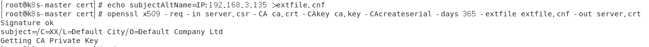echo subjectAltName = IP:192.168.3.135 > extfile.cnf openssl x509 -req -in server.csr -CA ca.crt -CAkey ca.key -CAcreateserial -days 365 -extfile extfile.cnf -out server.crt x509 签发X.509格式证书命令。 -req 表示证书输入请求。 -days 表示有效天数 -extensions 表示按OpenSSL配置文件v3_req项添加扩展。 -CA 表示CA证书,这里为ca.crt -CAkey 表示CA证书密钥,这里为ca.key -CAcreateserial表示创建CA证书序列号 -extfile 指定文件