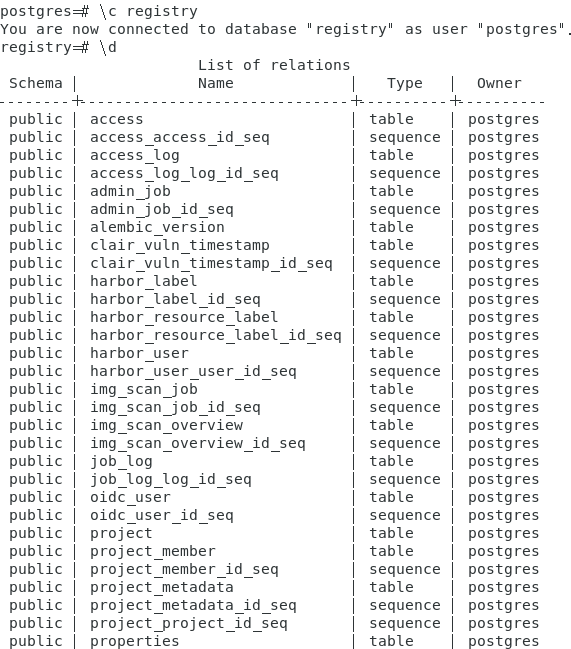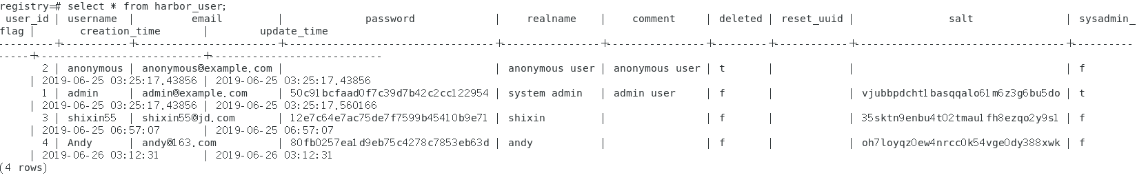 \c registry \d select * from harbor_user; #查询表数据 ###下面sql是更改用户信息 update harbor_user set username='QfdajasPPqcxz' where user_id=1; #更改admin用户名为QfdajasPPqcxz update harbor_user set sysadmin_flag='f' where user_id=1; #更改admin用户为普通权限 ###下面sql是直接删除admin用户 update harbor_user set deleted='t' where user_id=1; #删除admin用户 \q #退出数据库 exit #退出容器