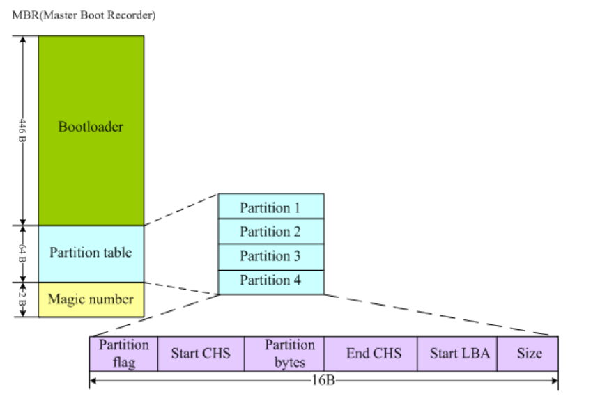 我们首先来了解一下MBR,它是Master Boot Record的缩写。硬盘的0柱面、0磁头、1扇区称为主引导扇区。它由三个部分组成,主引导程序(Bootloader)、 硬盘分区表DPT(Disk Partition table)和硬盘有效标志(55AA),其结构图如下所示: