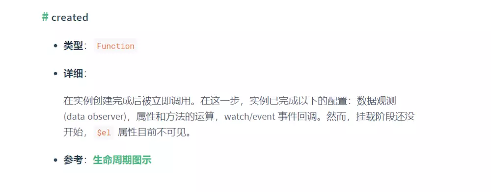 每个 Vue 实例在被创建之前都要经过一系列的初始化过程。例如,实例需要配置数据观测(data observer)、编译模版、挂载实例到 DOM ,然后在数据变化时更新 DOM 。在这个过程中,实例也会调用一些 生命周期钩子 ,这就给我们提供了执行自定义逻辑的机会。例如,created 这个钩子在实例被创建之后被调用: