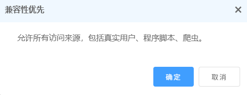 兼容性优先:这个模式允许所有访问来源,不管是真实用户、程序脚本还是爬虫,都能无障碍访问 。不过它的过滤效果基本为 0,主要适用于一些对兼容性要求特别高,不太在意假流量的场景 。
