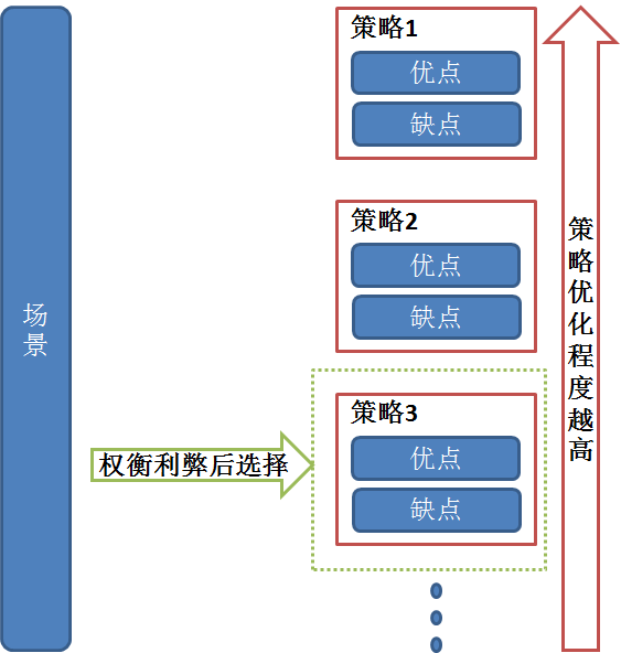 在利弊权衡之下,往往我们会选择一个折中方案(如下图那样中选择的策略3):