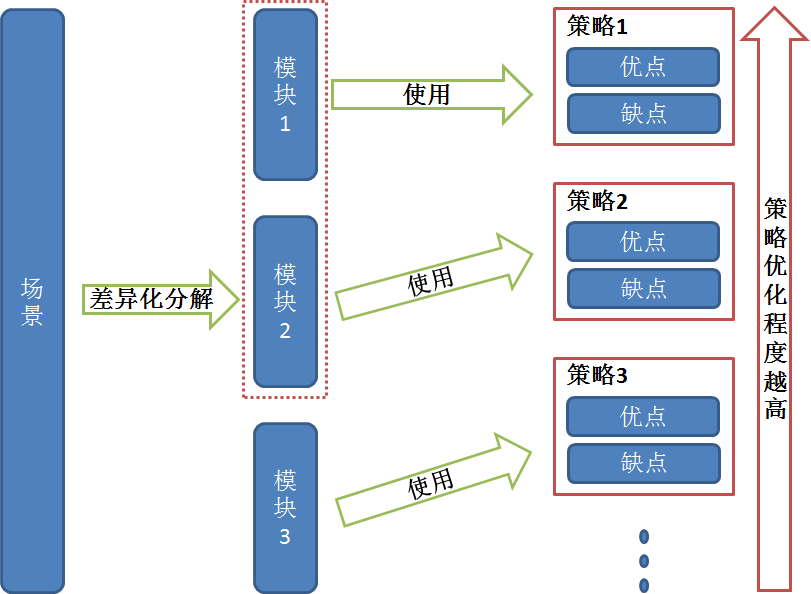 而更彻底的优化应该是,了解每个方案所导致的弊端影响,由弊端影响对项目场景进行差异化分析,按各场景对弊端影响面的容忍程度,实行策略方案的差异化。对于能接受弊端影响的场景,使用最优方案;而对于不太能接受弊端影响的场景,使用较优方案;依次类推到使用折中方案。从而做到差异化的精细优化。优化后的总体策略方案会变成类似下图的形式,原有项目只是单纯的使用折中策略3,而差异化处理后,会抽离出部分项目模块使用更优的策略1和策略2。