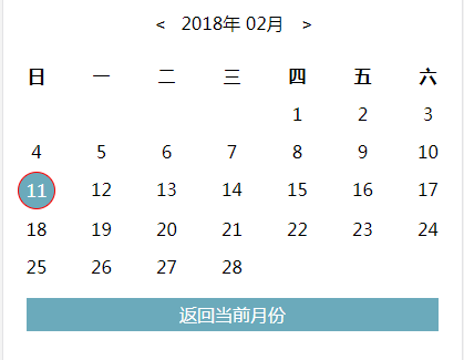 1 <div class="calendar"> 2 <caption> 3 <div class="title"> 4 <div class="leftArr"><</div> 5 <div class="date"> 6 <span class="year"></span>年 7 <span class="month"></span>月 8 <!-- <span class="day"> </span>日 --> 9 </div> 10 <div class="rightArr">></div> 11 </div> 12 </caption> 13 <table> 14 <thead> 15 <tr> 16 <th><i>日</i></th> 17 <th><i>一</i></th> 18 <th><i>二</i></th> 19 <th><i>三</i></th> 20 <th><i>四</i></th> 21 <th><i>五</i></th> 22 <th><i>六</i></th> 23 </tr> 24 </thead> 25 <tbody></tbody> 26 </table> 27 </div> 28 <div class="back">返回当前月份</div>