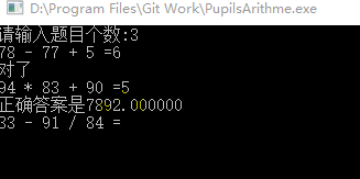 1 float createEquation() { 2 int number1, number2, number3, operation1, operation2; 3 float input_answer, answer = 0; 4 do { 5 srand(time(0)); 6 number1 = rand()%100+1; 7 number2 = rand()%100+1; 8 number3 = rand()%100+1; 9 operation1 = rand()%4+1; 10 operation2 = rand()%4+1; 11 if(operation1 == multiplication || operation1 == division) { 12 answer = calculate(calculate(number1, number2, operation1), number3, operation2 ); 13 } 14 else { 15 if(operation2 == multiplication || operation2 == division) { 16 answer = calculate(number1 ,calculate(number2, number3, operation1), operation2 ); 17 } 18 else { 19 answer = calculate(calculate(number1, number2, operation1), number3, operation2 ); 20 } 21 } 22 }while(answer < 0); 23 printf("%d %c %d %c %d =",number1, operation(operation1),number2, operation(operation2), number3); 24 scanf("%f", &input_answer); 25 if(answer == input_answer) { 26 printf("对了"); 27 } 28 else { 29 printf("正确答案是%f", answer); 30 } 31 32 printf("\n"); 33 }