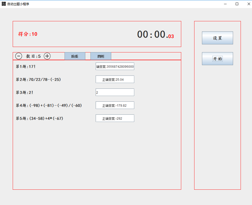 - 程序可以出单个整数阶乘的题目:如:4!=24