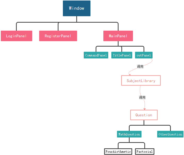 总体上分为如上三大块,Window模块中只负责用户的输入输出,将题目委托给SubjectLibrary管理,而SubjectLibrary只负责相应题库题目的生成,不关心题目的计算过程等。最终每一种题型由一个实例构成。