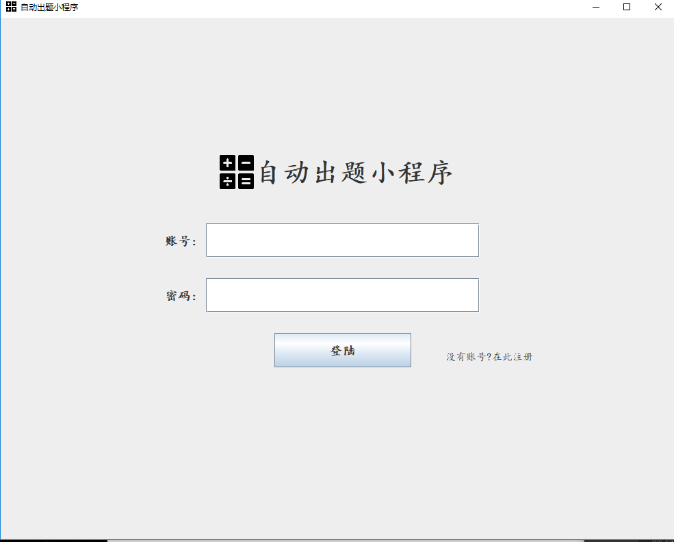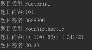 SubjectLibrary test = new SubjectLibrary(5); // 构造题库 test.registerQuestion(FourAirthmetic.questionType); // 注册题目类型 test.registerQuestion(Factorial.questionType); test.initLib(); // 生成题目 for (Question question : test.getLib()) { // 获取题目 System.out.println("题目类型:"+question.getQuestionType()); System.out.println("题目内容:"+question.getQuestion()); System.out.println("题目答案:"+question.getAnswer()); }