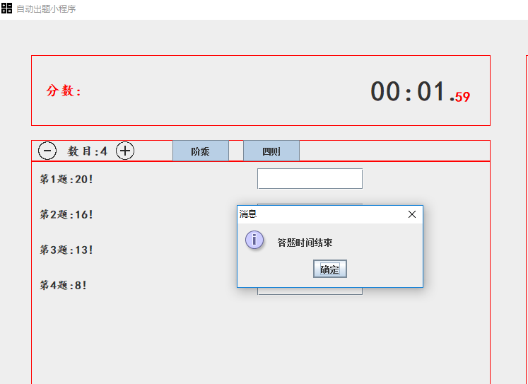 - 程序可以设置答题时间,时间设置为整数,单位为秒,最大不能超过120秒,若超过了答题时间未答题,则提示:时间已到,不能答题。