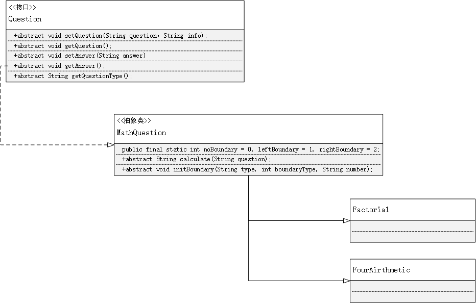 我们在设计中想,题库只关心题目的生成和其他操作,并不会具体关心题目的个体差异,无论是阶乘还是四则运算都应该是一种操作,所以我们将二者的共性抽离出,同时考虑到未来题库可能管理的不是是数学类型的题目,所以我们设计了如下结构。