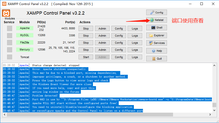 20:46:47 [Apache] Port 443 in use by ""D:\Program Files (x86)\VMware\VMware Workstation\vmware-hostd.exe" -u "C:\ProgramData\VMware\hostd\config.xml"" with PID 9168!