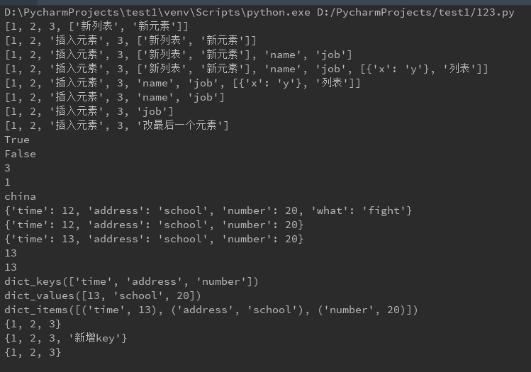 ''' 列表的增删改查 ''' List = [1, 2, 3] # 增 append / insert / extend List.append(['新列表', '新元素']) # 将新元素追加到列表末尾 print(List) # --> [1, 2, 3, ['新列表', '新元素']] List.insert(2, '插入元素') # 将新元素插入到列表的指定位置处 print(List) # --> [1, 2, '插入元素', 3, ['新列表', '新元素']] List.extend({'name': 'Tom', 'job': 'CTO'}) # 将集合中的元素拆开放入列表(若该集合为字典则只放入key) print(List) # --> [1, 2, '插入元素', 3, ['新列表', '新元素'], 'name', 'job'] List.extend([[{'x': 'y'}, '列表']]) # 将集合中所有元素拆开放入列表 print(List) # --> [1, 2, '插入元素', 3, ['新列表', '新元素'], 'name', 'job', [{'x': 'y'}, '列表']] # 删 del / pop / remove del List[4] # 删除对应下标的值 print(List) # --> [1, 2, '插入元素', 3, 'name', 'job', [{'x': 'y'}, '列表']] List.pop() # 默认删除最后一个元素 # List.pop(index) # 删除下标index处的元素 print(List) # [1, 2, '插入元素', 3, 'name', 'job'] List.remove('name') # 删除列表中value为 'name' 的值 print(List) # del List #删除整个列表,并且列表变量List也被删除. 打印会报错 # print(List.clear()) # 清空列表中的元素,但是列表的变量还在. --> [] # 改 直接对指定下标的元素赋值即可 List[-1] = '改最后一个元素' # 对倒数第一个元素赋值 print(List) # [1, 2, '插入元素', 3, '改最后一个元素'] # 查 in / not in / index / count print(2 in List) # 查询某元素是否在列表中. --> True print(2 not in List) # 查询某元素是否不再列表中. --> False print(List.index(3, 0, len(List))) # 查询3是否在该列表中(二、三参可略),若在,返回该元素下标,否则报错. --> 3 print(List.count(1)) # 统计1在列表中出现的次数. --> 1 ''' 元组的查询, 因元组无法修改而没有增、删、改 ''' Tuple = ('china', 'beijing') # 查 index 与 count方法与列表相同,本处不举例说明 print(Tuple[0]) # 通过元组的下标访问元素. --> china ''' 字典的增删改查与遍历 ''' Dict = {'time': 12, 'address': 'school', 'number': 20} # 增 直接通过键值对赋值即可添加 Dict['what'] = 'fight' print(Dict) # --> {'time': 12, 'address': 'school', 'number': 20, 'what': 'fight'} # 删 del / clear del Dict['what'] # 删除'what'对应的键值对 # Dict.pop('what') # 功能同上 print(Dict) # -->{'time': 12, 'address': 'school', 'number': 20} # del Dict # 删除整个字典,包括变量 # Dict.clear() # 清空字典,但是字典的变量还在 # 改 直接对已有的键进行赋值 Dict['time'] = 13 # 直接赋值为13 print(Dict) # 查 dict['key'] / dict.get('key') print(Dict['time']) # 直接查询'time'对应的值,此种方式若该key不存在,则报错 print(Dict.get('time')) # 功能同上,但若该key不存在会返回None,而不是报错 # 遍历 print(Dict.keys()) # 遍历key. --> dict_keys(['time', 'address', 'number']) print(Dict.values()) # 遍历value. --> dict_values([13, 'school', 20]) print(Dict.items()) # 遍历键值对. --> dict_items([('time', 13), ('address', 'school'), ('number', 20)]) ''' set的一些性质: 是一组key的集合,但是不会存储value,这一点要和字典作区别 set内的元素无序且不可重复 ''' # 创建一个set,需要提供一个list作为输入 s = set([1, 2, 3]) print(s) # --> {1, 2, 3} # 增 add(key) s.add('新增key') print(s) # --> {1, 2, 3, '新增key'} 新增的元素也许会在集合内的任何位置,每次执行结果也不尽相同! # 删 remove(key) s.remove('新增key') # s.pop() # 删除首个元素 谁在最前面删除谁 print(s) # --> {1, 2, 3}