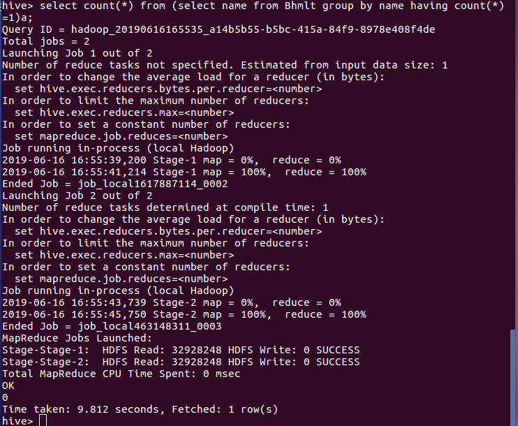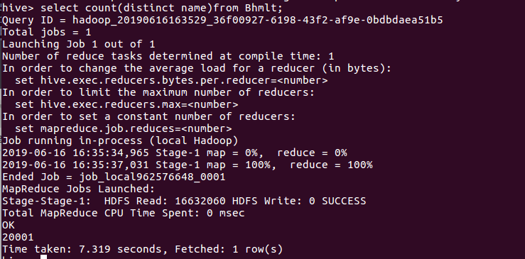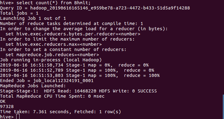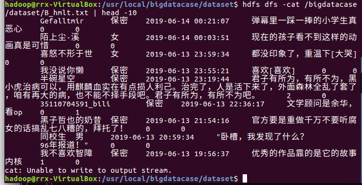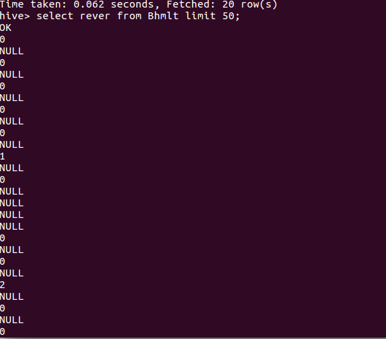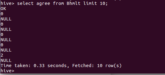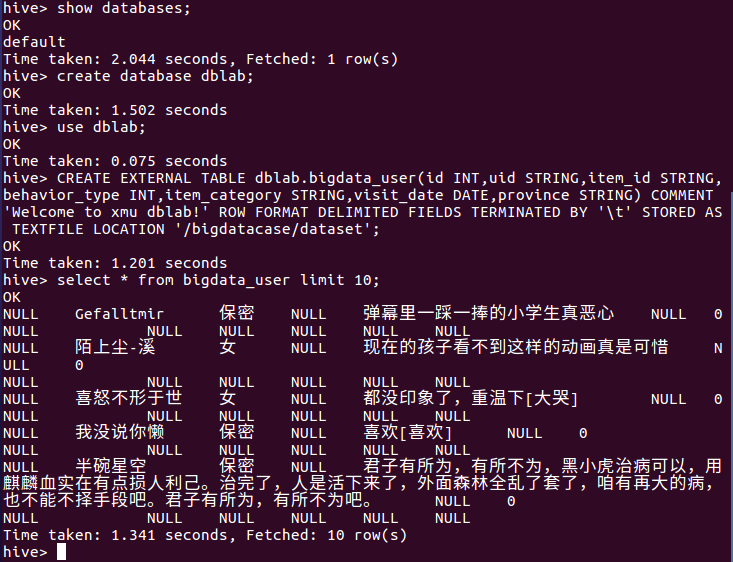 5、在把hdfs中的“/bigdatabase/dataset”目录下的数据加载到了数据仓库的hive中的,在hive中查看数据,查找表的前10条记录: