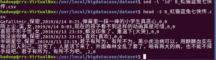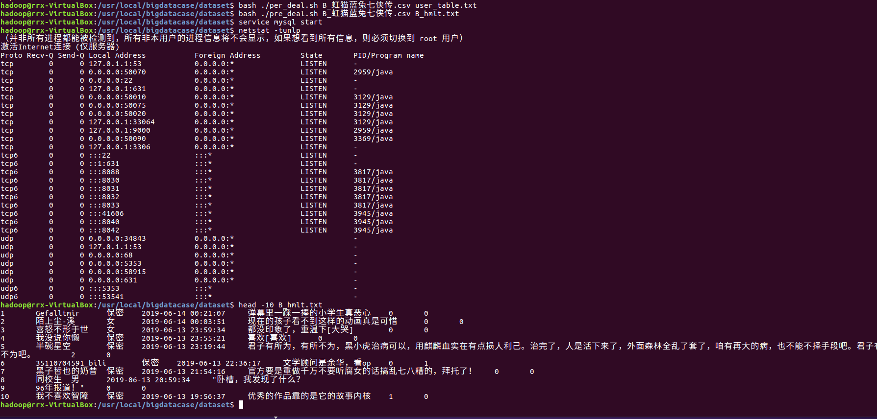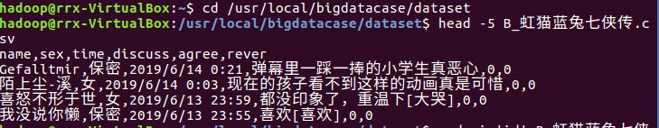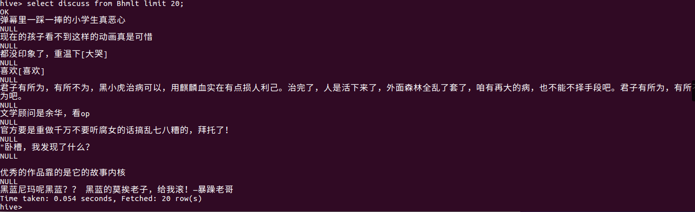 本案例主要分析在豆瓣爬取的短评数据,数据字段包括地址、评论时间、评论内容、评价程度、用户名和投票数6个属性值,将数据上传到hdfs的hive数据仓库中进行简要分析。