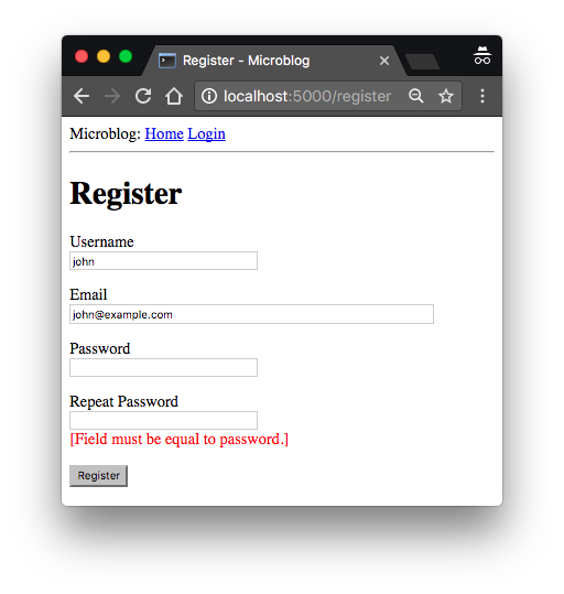代码中与验证相关的几处相当有趣。首先,对于email字段,我在DataRequired之后添加了第二个验证器,名为Email。 这个来自WTForms的另一个验证器将确保用户在此字段中键入的内容与电子邮件地址的结构相匹配。