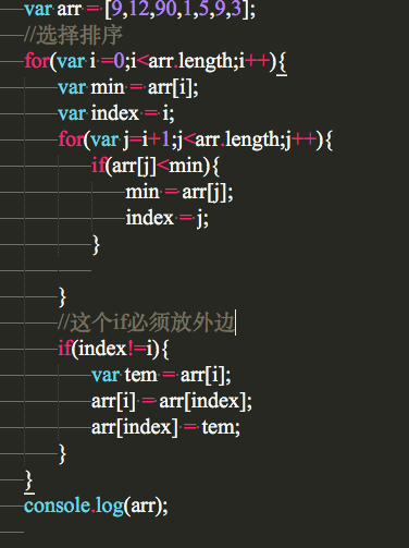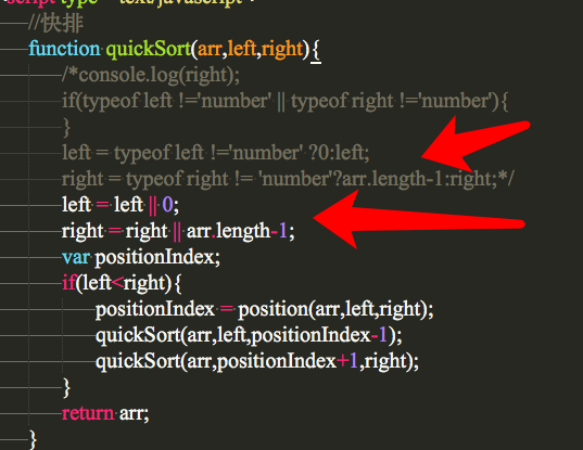 function quickSort(arr, left, right) { var len = arr.length, partitionIndex, left = typeof left != 'number' ? 0 : left, right = typeof right != 'number' ? len - 1 : right; if (left < right) { partitionIndex = partition(arr, left, right); quickSort(arr, left, partitionIndex-1); quickSort(arr, partitionIndex+1, right); } return arr; } function partition(arr, left ,right) { //分区操作 var pivot = left, //设定基准值(pivot) index = pivot + 1; for (var i = index; i <= right; i++) { if (arr[i] < arr[pivot]) { swap(arr, i, index); index++; } } swap(arr, pivot, index - 1); return index-1; } function swap(arr, i, j) { var temp = arr[i]; arr[i] = arr[j]; arr[j] = temp; }