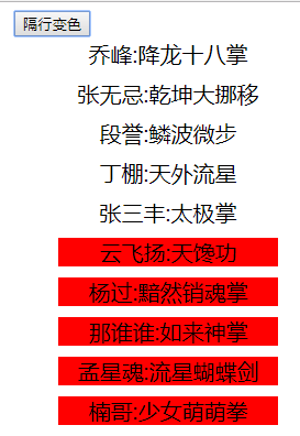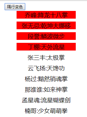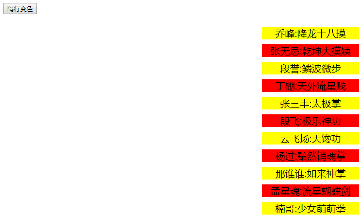 1 <!DOCTYPE html> 2 <html> 3 <head> 4 <meta charset="utf-8"> 5 <title>隔行变色</title> 6 7 <style type="text/css"> 8 ul{ 9 list-style: none; 10 width: 200px; 11 position: absolute; 12 left: 500px; 13 } 14 15 ul li{ 16 margin-top: 10px; 17 cursor: pointer; 18 text-align: center; 19 font-size: 20px; 20 } 21 </style> 22 23 <script src="js/jquery-1.12.2.js" type="text/javascript" charset="utf-8"></script> 24 <script type="text/javascript"> 25 $(function(){ 26 $("#btn").click(function(){ 27 28 //奇数行,背景设置为红色 29 $("#uu>li:odd").css("backgroundColor","red"); 30 //偶数行,背景为黄色 31 $("#uu>li:even").css("backgroundColor","yellow"); 32 }); 33 }); 34 </script> 35 </head> 36 <body> 37 <input type="button" id="btn" value="隔行变色" /> 38 <ul id="uu"> 39 <li>乔峰:降龙十八掌</li> 40 <li>张无忌:乾坤大挪移</li> 41 <li>段誉:鳞波微步</li> 42 <li>丁棚:天外流星</li> 43 <li>张三丰:太极掌</li> 44 <li>云飞扬:天馋功</li> 45 <li>杨过:黯然销魂掌</li> 46 <li>那谁谁:如来神掌</li> 47 <li>孟星魂:流星蝴蝶剑</li> 48 <li>楠哥:少女萌萌拳</li> 49 </ul> 50 </body> 51 </html>