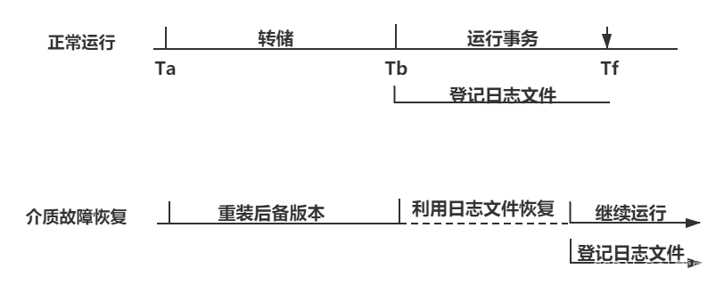 系统在Ta时刻停止运行事务,进行数据转储,在Tb时刻转储完毕,得到Tb时刻的数据库一致性副本。系统运行到Tf时刻发生故障。为恢复数据,首先由数据库管理员重装数据库后背版本,将数据库恢复至Tb时刻的状态,重新运行自Tb~Tf时刻的所有更新事务,这样就把数据库恢复到故障发生前的一致状态。