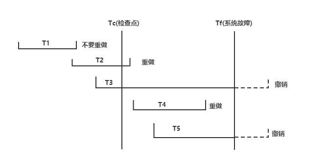 T3和T5在故障发生时还未完成,所以予以撤销操作,T2和T4在检查点之后提交,他们对数据库所作的修改在故障发生时可能还在缓冲区中,尚未写入数据库,所以要重做;T1在检查点之前提交所以不必执行重做操作。