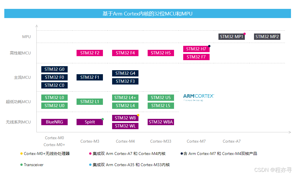 - 内核依赖:STM32是基于ARM Cortex-M内核的微控制器系列。ARM Cortex-M是ARM公司专为低功耗、低成本和高性能的嵌入式应用设计的32位处理器内核。STM32通过采用这些内核,实现了其在嵌入式市场中的广泛应用。