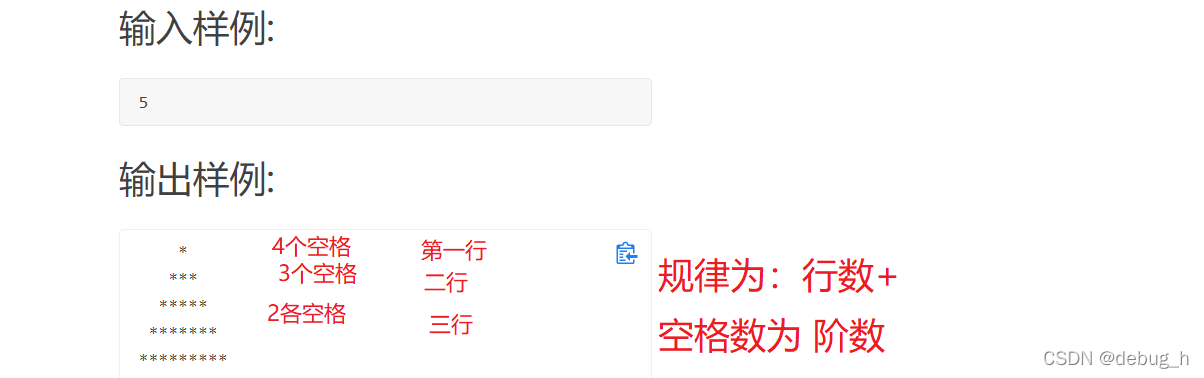 空格的个数为行数减去阶数,*的个数为:在随着行数的增加而减少(增加一行,减少2个),并且第一行*个数为2*n-3;