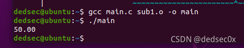 首先输入命令gcc -c sub1.c将sub1.c程序转换为目标文件sub1.o然后输入命令gcc main1.c sub1.o -o main1编译main1.c文件为目标文件main1.o,然后链接sub1.o目标文件生成main1可执行文件。最后执行./main1命令,即可执行编译生成的main1程序